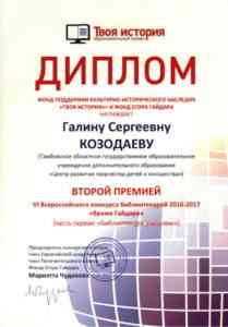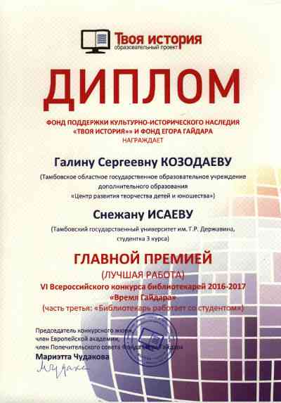 16 июня 2017 года в Москве состоялась церемония награждения участников Всероссийского конкурса библиотекарей «Время Гайдара». Заведующая библиотекой Галина Сергеевна Козодаева заняла 2-е место в номинации «Библиотекари учителям». В номинации «Библиотекарь работает со студентом» совместно с Исаевой Снежаной, студенткой 3 курса направления лингвистики ТГУ им. Державина г. Тамбова – 1-е место за лучшую работу. Все победители были награждены почетными грамотами, поощрительной премией, комплектом книг для библиотеки, а также другими подарками с логотипом Фонда имени Е.Т. Гайдара.