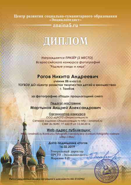Поздравляем учащегося объединения «МедиаДом» Рогова Никиту, занявшего II место во Всероссийском конкурсе фотографий «Родные улицы и лица» (руководитель Мартынов А.А.)