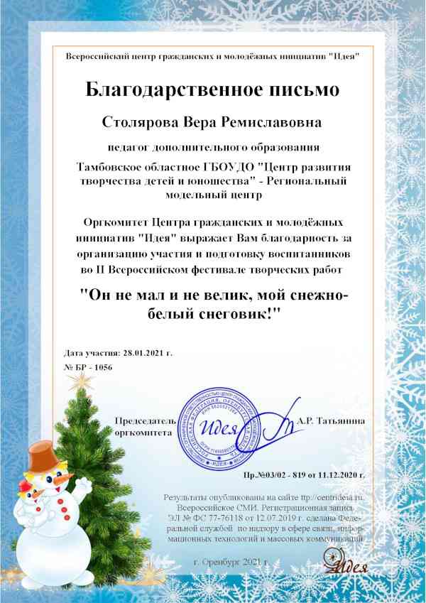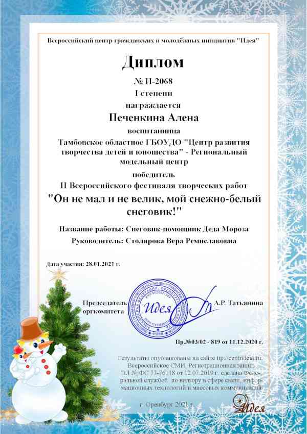 Всероссийский фестиваль творческих работ «Он не мал и не велик, мой снежно-белый снеговик!» проводится с целью развития творческих способностей учащихся, его организатором является Центр гражданских и молодежных инициатив «Идея» (город Оренбург).
