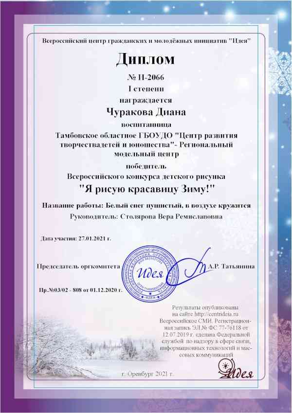 Поздравляем Зубареву Викторию и Чуракову Диану, учащихся объединения «Художественная студия» (педагог Столярова В.Р.), с победой в конкурсе «Я рисую красавицу Зиму!» и желаем ребятам дальнейших творческих успехов!