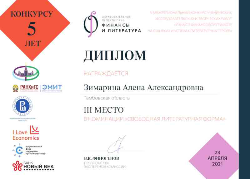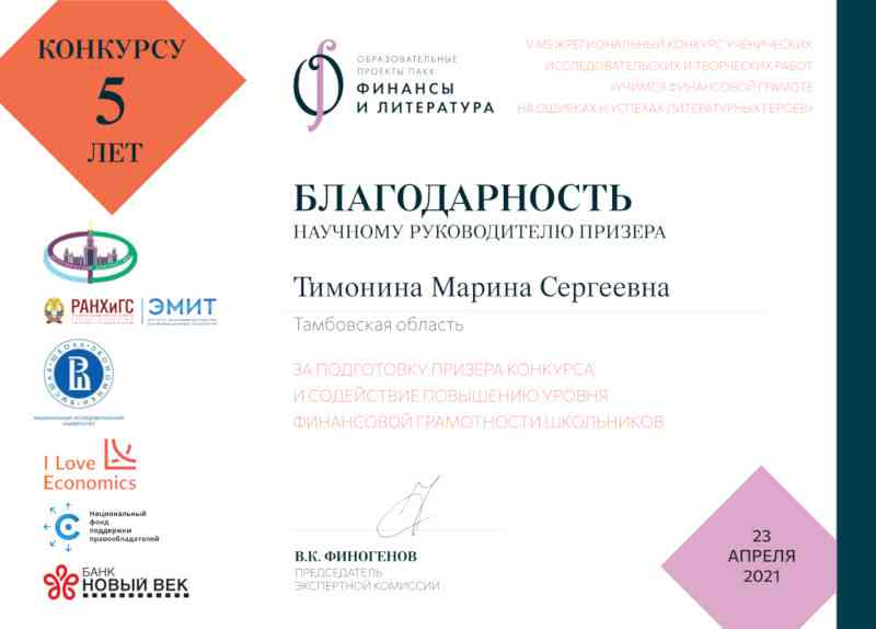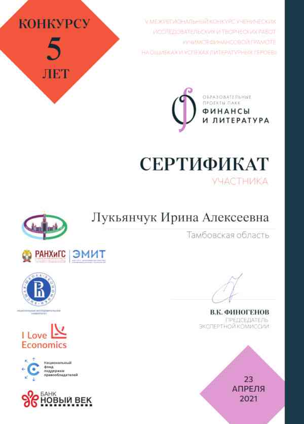 Завершился V юбилейный конкурс ученических исследовательских и творческих работ «Учимся финансовой грамоте на ошибках и успехах литературных героев». Организаторами Конкурса являются Консультационная компания «ПАКК», Экономический факультет МГУ им. М.В. Ломоносова, Институт экономики, математики и информационных технологий РАНХиГС при Президенте РФ, Банк «Новый век». Конкурс проводится с целью содействия формированию основ грамотного финансового поведения школьников и формирования у школьников навыков анализа личного финансово-экономического поведения на примере поступков, решений и личной финансовой стратегии персонажей литературных произведений.