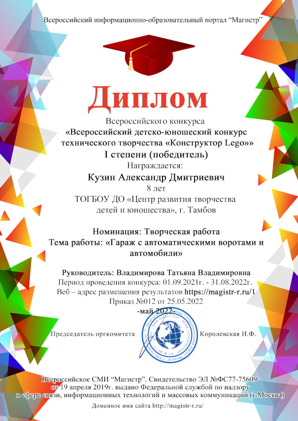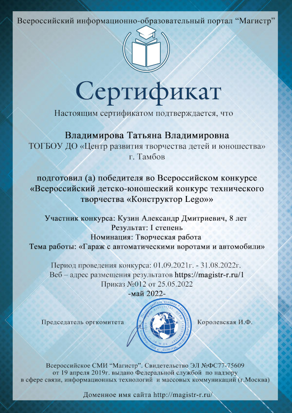 Поздравляем учащегося Центра интеллектуального и творческого развития ребёнка «УникУМ» Александра Кузина (объединение «Легоконструирование») и педагога дополнительного образования Татьяну Владимировну Владимирову с победой во «Всероссийском детско-юношеском конкурсе технического творчества «Конструктор Lego»! Александр получил Диплом I степени за свою работу «Гараж с автоматическими воротами и автомобилями» в номинации «Творческая работа воспитанника».
